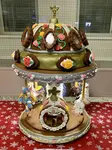 This year’s gingerbread, my 5th. Dome, top, bottom, support column (covered in fondant ), and seat are all gingerbread. Horses are hand shaped fondant.