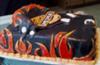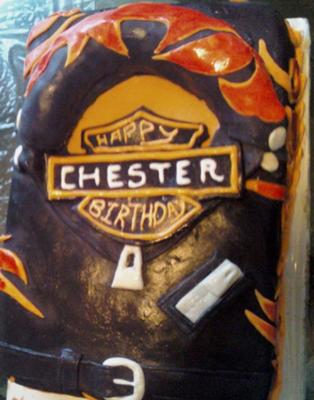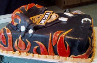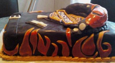 I created this for a friend's father, made out of chocolate cake and fondant. The collar isn't just the collar but it is also what his seat looks like from his Harley. The rest is a jacket in flames. I made edible paint to paint the flames. |