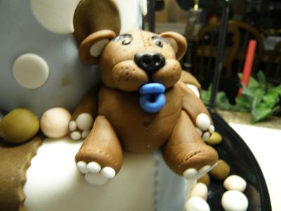 My daughter picked out a cake for me to make for her baby shower that had animals on it. So I investigated working with fondant. Someone told me that it was a lot like working with play doe, so I went out and bought some. I spent the next two weeks making play doe animals before I used the fondant. It turned out nice, but did start melting in the 85 degree day. |