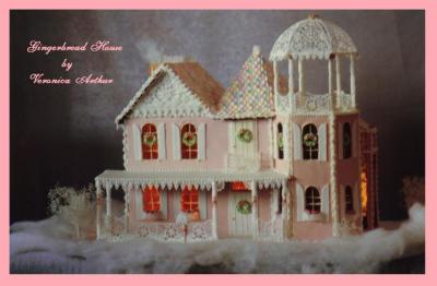 I was 19 when I made this one. (My very first Gingerbread house!) I entered it in the 1988 Good housekeeping Gingerbread house contest and won 5th place! That's prety good considering I had started decorating cakes only 2 years before that! The rails and the gazebo on the tower and all the "lacey" looking pieces are all made completely of royal icing.